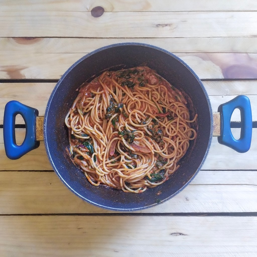 Espaguetti con salsa de tomate, chile de árbol, queso mozzarella y espinacas