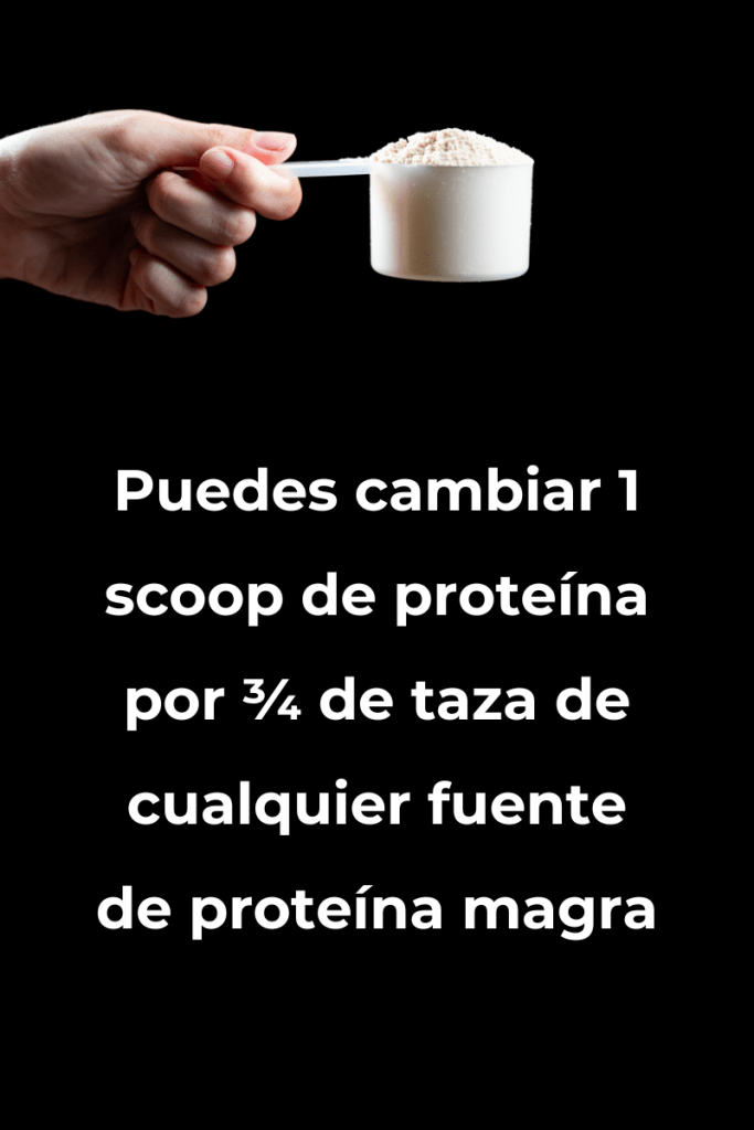 En resumen, puedes reemplazar un scoop de proteína por aproximadamente ¾ de taza de cualquier fuente de proteína magra (baja en grasas) y baja en carbohidratos.